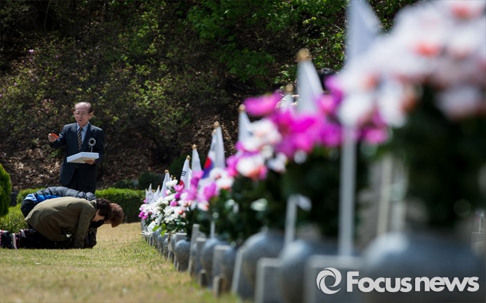 (서울=포커스뉴스) 4·19 혁명 56주기를 하루 앞둔 18일 오전 서울 강북구 국립4.19 민주묘지에서 희생자의 유가족들이 절하고 있다.