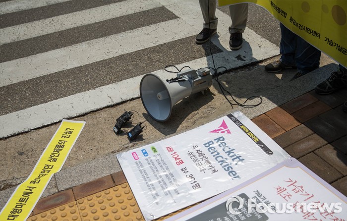 (서울=포커스뉴스) 18일 오전 서울 서초구 서울중앙지방검찰청 앞에서 가습기살균제피해자와가족모임 등 단체들이 엄정한 가습기 살균제 피해 조사를 촉구하는 기자회견을 하고 있다.