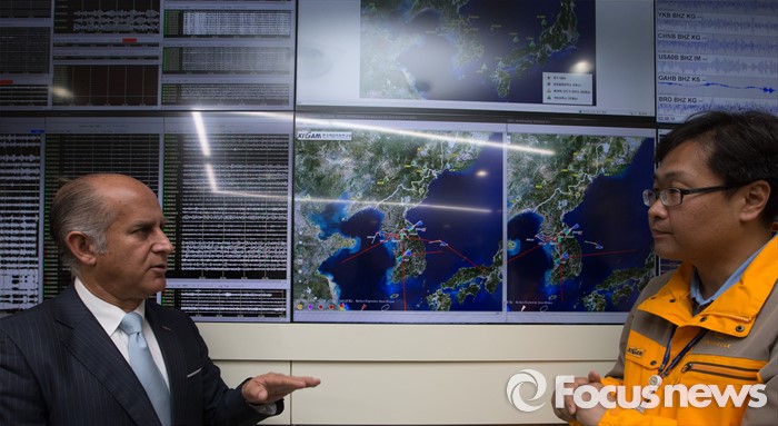 (대전=포커스뉴스) 오스카 에레라 주한 에콰도르 대사가 18일 오전 대구 유성구 한국지질자원연구원 내 지진연구센터 상황실을 방문, 에콰도르 현지 지진상황에 대한 설명듣고 있다.