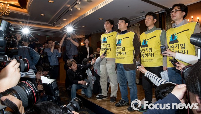 피해자들이 고발한 인원은 제조사인 옥시렌킷벤키저·SK케미칼을 포함해 판매사인 롯데마트·홈플러스·애경·신세계 이마트 등 관련업체 전·현직 임직원 256명이다. 검찰은 18일부터 이들에 대한 소환조사를 시작한다.(서울=포커스뉴스) 18일 오전 서울 중구 롯데호텔앤리조크 서울에서 열린 가습기 살균제 사망사건 관련 기자회견이 끝나고 피해자 유족들을 비롯한 시민단체 회원들이 입장을 발표하고 있다. 2016.04.18 조종원 기자