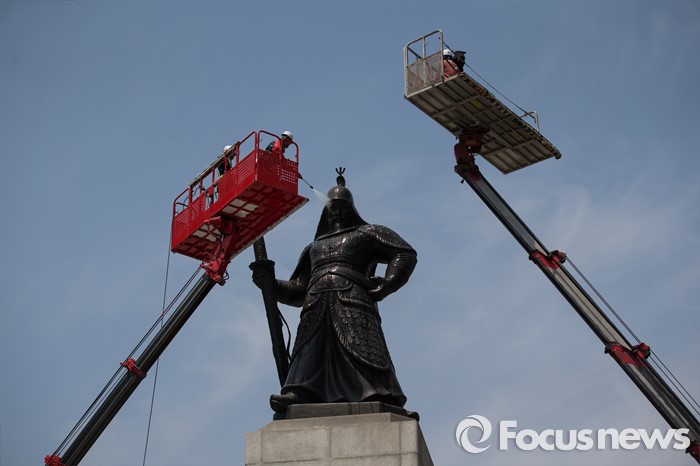 (서울=포커스뉴스) 18일 오전 서울 세종로사거리 광화문광장에서 서울시 관계자들이 이순신장군 동상 세척 및 보존 작업을 하고 있다.