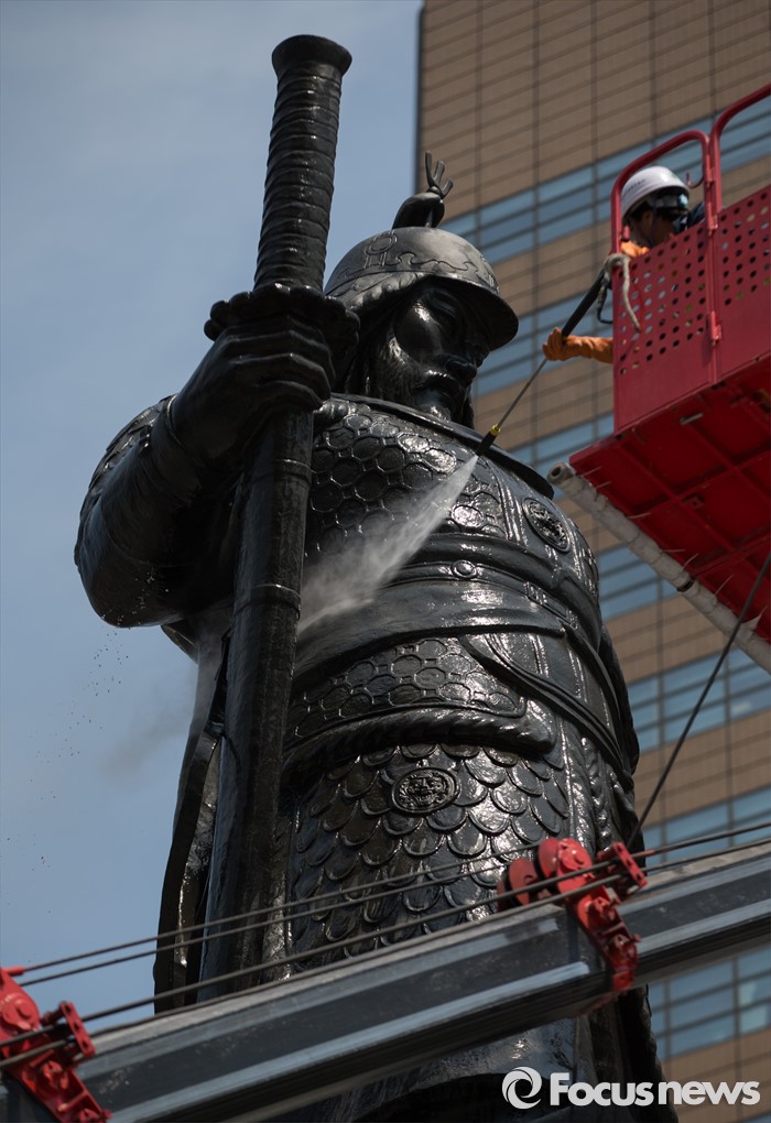 (서울=포커스뉴스) 18일 오전 서울 세종로사거리 광화문광장에서 서울시 관계자들이 이순신장군 동상 세척 및 보존 작업을 하고 있다.