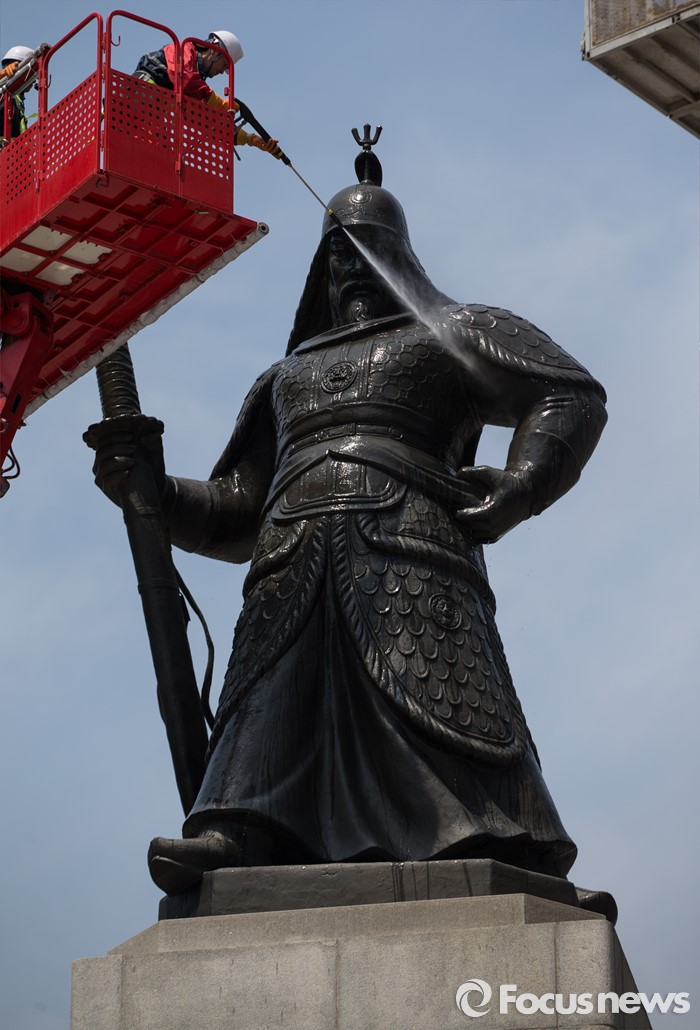 (서울=포커스뉴스) 18일 오전 서울 세종로사거리 광화문광장에서 서울시 관계자들이 이순신장군 동상 세척 및 보존 작업을 하고 있다.