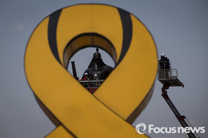 | △ 이순신 장군 동상 보존 작업, 노란리본 바라보는 장군. |