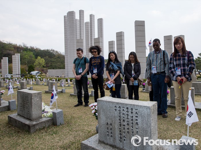 (서울=포커스뉴스) 4·19 혁명 56주기를 하루 앞둔 18일 오후 서울 강북구 국립4.19 민주묘지에서 한신대학교 신학과 외국인 학생들이 희생자 묘소를 참배하고 있다.