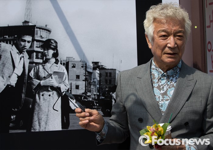 (서울=포커스뉴스) 18일 오후 서울시청 앞 광장에서 열린 '한국영화 100년 사진전' 개막식에서 배우 신성일이 전시된 작품들을 설명하고 있다.