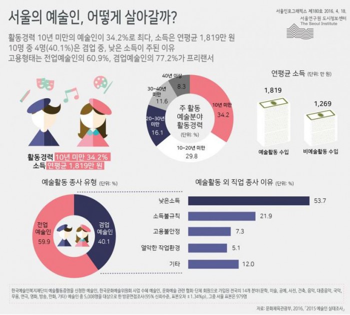 18일 서울연구원에 따르면 서울의 예술인들의 소득연평균은 1819만원으로, 10명 중 4명(40.1%)이 겸업을 하고 있는 것으로 나타났다.