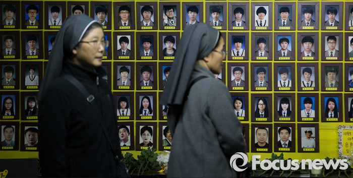 (서울=포커스튜스) 세월호 참사 2주기가 이틀 지난 18일 오후 서울 종로구 광화문광장에서 신부들과 시민들이 '세월호 희생자 기억미사' 전 희생자를 추모하고 있다.