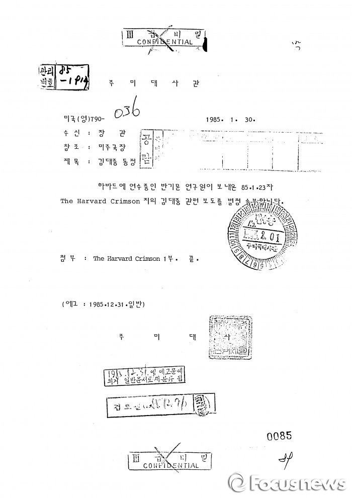 이번에 공개된 외교문서는 △베트남 잔류 동포 및 이산가족 출국 △김대중(前 대통령) 귀국 △여성에 대한 모든 형태의 차별철폐에 관한 협약 한국 가입 △한·중공 교역 추진 등의 내용이 포함돼 있으며 서울 서초구 외교사료관에서 열람 가능하다.외교부가 17일 공개한 1985년 김대중 전 대통령의 하버드 연설과 관련해 주미대사관에서 중앙정부로 보낸 외교문서 <사진출처=외교부>외교부가 17일 공개한 1985년 김대중 전 대통령의 하버드 연설 관련해 반기문 총장이 발췌한 교내 일간지 기사 <사진출처=외교부>