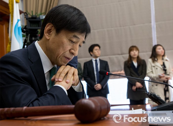 (서울=포커스뉴스) 이주열 한국은행 총재가 19일 오전 서울 중구 남대문로 한국은행 본관에서 열린 금융통화위원회의에 참석해 생각에 잠겨 있다.
