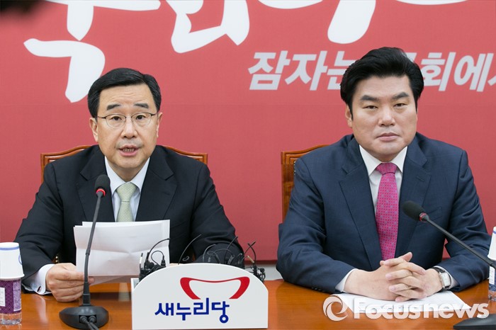 (서울=포커스뉴스) 김정훈(왼쪽) 새누리당 정책위의장이 19일 오전 서울 여의도 국회에서 열린 원내대표단회의에 참석해 발언하는 동안, 원유철 원내대표가 생각에 잠겨 있다.