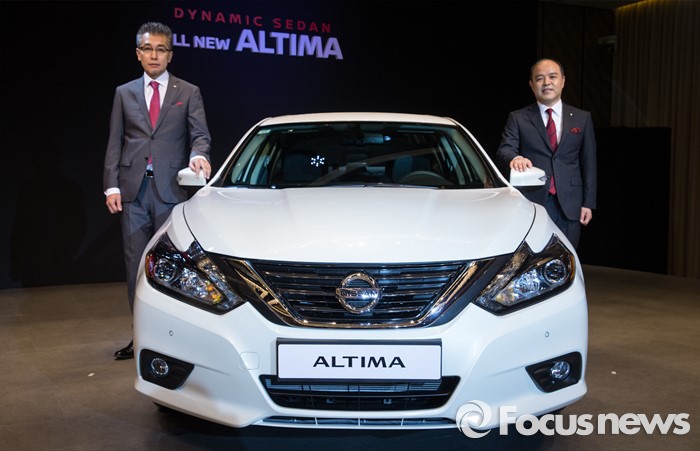 (서울=포커스뉴스) 19일 오전 서울 종로구 포시즌스호텔서울에서 열린 닛산 'ALL NEW ALTIMA' 미디어 포토세션에 참여한 타케히코 키쿠치(오른쪽) 한국닛산 대표와 마사히데 아마다 알티마 상품개발 총괄이 신차앞에서 포즈를 취하고 있다.