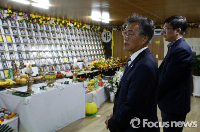 (서울=포커스뉴스) 문재인(왼쪽) 더불어민주당 전 대표와 故 김대중 전 대통령의 3남 김홍걸 국민통합위원장이 지난 18일 전남 진도 팽목항에 마련된 세월호 참사 희생자 분향소를 찾아 조문하고 있다. <사진제공=문재인 의원실>