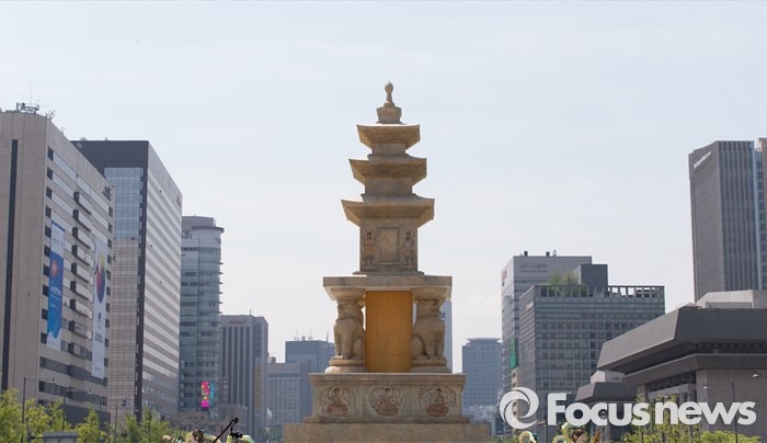 (서울=포커스뉴스) 19일 오전 서울 광화문광장에 봉축장엄등이 설치돼 있다. 20일 광화문광장에서 열리는 봉축장엄등 점등식은 국보 제35호인 화엄사 사사자삼층석탑을 원형으로 삼아 제작됐다.