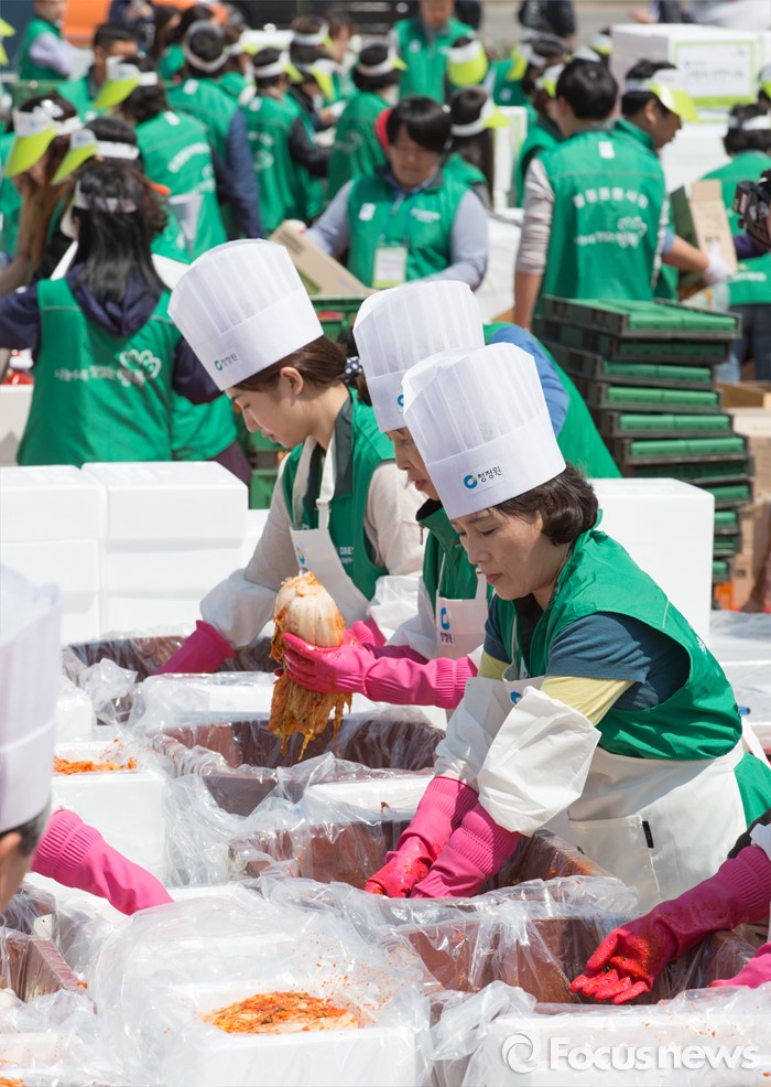 (서울=포커스뉴스) 19일 오전 서울 광화문광장에서 청정원 사랑의 반찬나눔 행사에 참석한 대상 임직원들과 자원봉사자들이 어려운 이웃들에게 전달할 선물세트를 포장하고 있다.