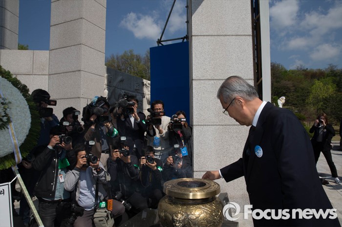 (서울=포커스뉴스) 19일 오전 서울 강북구 국립 4.19 민주묘지에서 열린 '제56주년 4.19혁명 기념식'이 끝나고 김종인 더불어민주당 비대위 대표가 분향하고 있다.