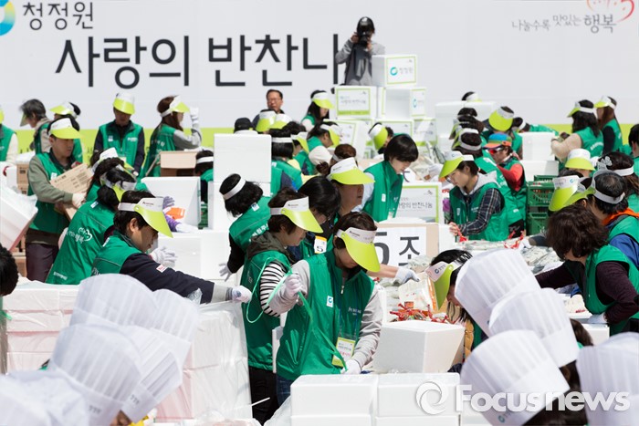 (서울=포커스뉴스) 19일 오전 서울 광화문광장에서 청정원 사랑의 반찬나눔 행사에 참석한 대상 임직원들과 자원봉사자들이 어려운 이웃들에게 전달할 선물세트를 포장하고 있다.