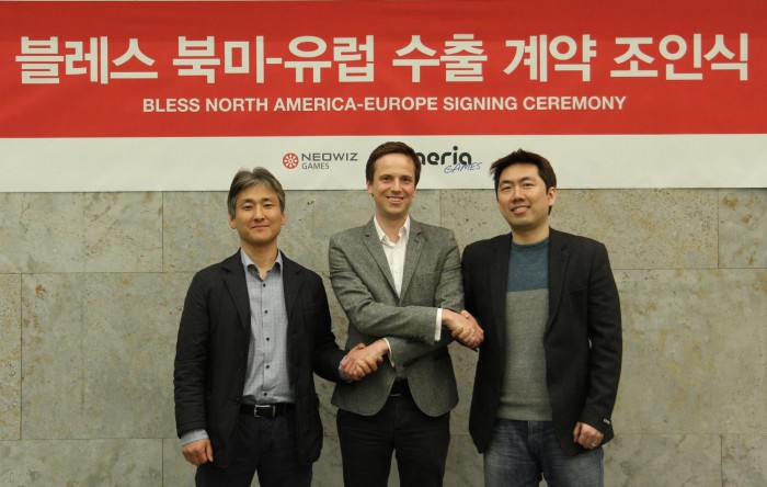 아에리아게임즈 올리버 스트루틴스키 대표는 "조인식을 통해 양사가 파트너로 함께 하게 된 것은 매우 영광스럽고 기쁜 일"이라며, "블레스는 성공 가능성이 매우 높은 게임으로, 현지 게이머들도 최고의 경험을 할 것으로 기대한다"고 말했다.블레스 북미∙유럽 수출 계약 조인식에서 네오위즈게임즈 이기원(좌), 아에리아 게임즈 올리버 스트루틴스키(가운데), 네오위즈블레스스튜디오 한재갑(우) 대표가 기념 촬영을 하는 모습 <사진제공=네오위즈게임즈>