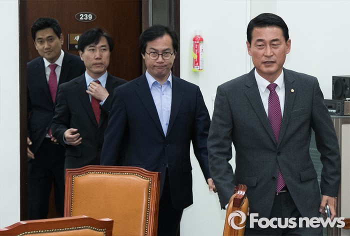 (서울=포커스뉴스) 원유철 새누리당 원내대표의 비상대책위원회 체제에 반대 입장을 가진 의원 및 당선인으로 구성된 당 혁신모임(가칭) 소속 의원들이 19일 오후 서울 여의도 국회에서 원 원내대표와 면담을 위해 입장하고 있다. 오른쪽부터 황영철, 김영우, 하태경, 오신환 의원.