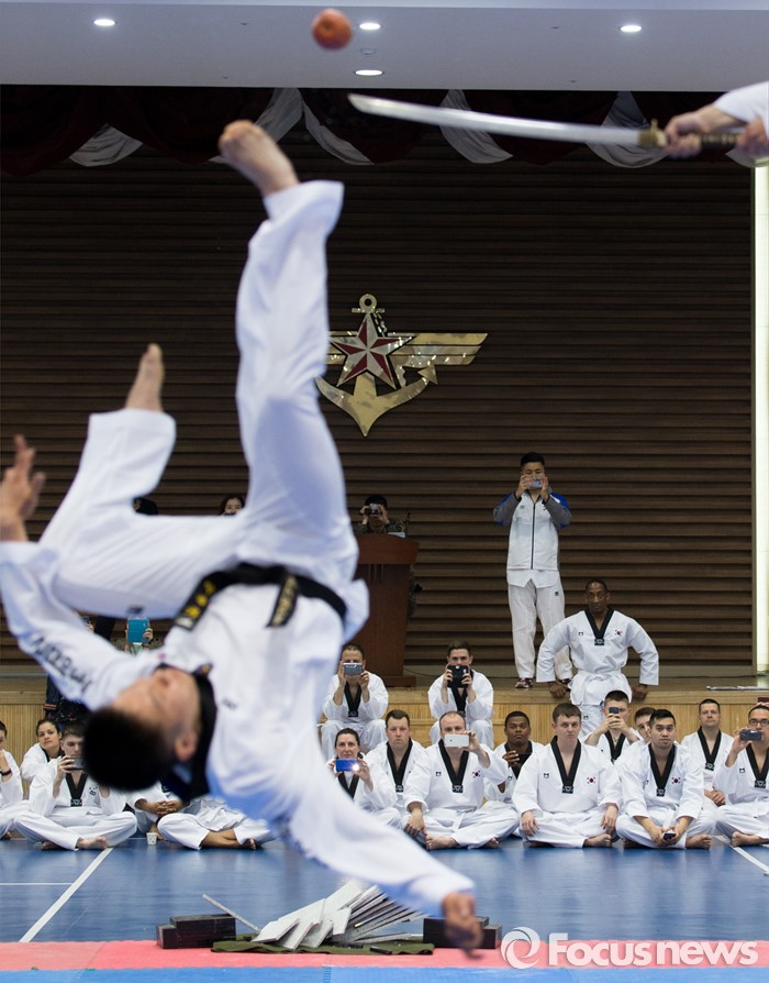 (서울=포커스뉴스) 19일 오후 서울 용산구 국방부 다목적홀에서 한국문화 체험행사에 참가한 주한미군 장병들이 국방부 태권도 시범단의 시범을 보고 있다.