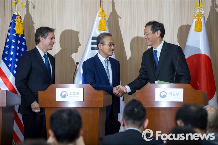 (서울=포커스뉴스) 한미일 외교차관이 19일 오후 서울 종로구 외교부 브리핑실에서 '제3차 한미일 외교차관 협의회' 결과 발표를 마친 뒤 악수하고 있다. 왼쪽부터 토니 블링컨 미국 국무부 부장관, 임성남 외교부 제2차관, 사이키 아키타카 일본 외무성 사무차관.
