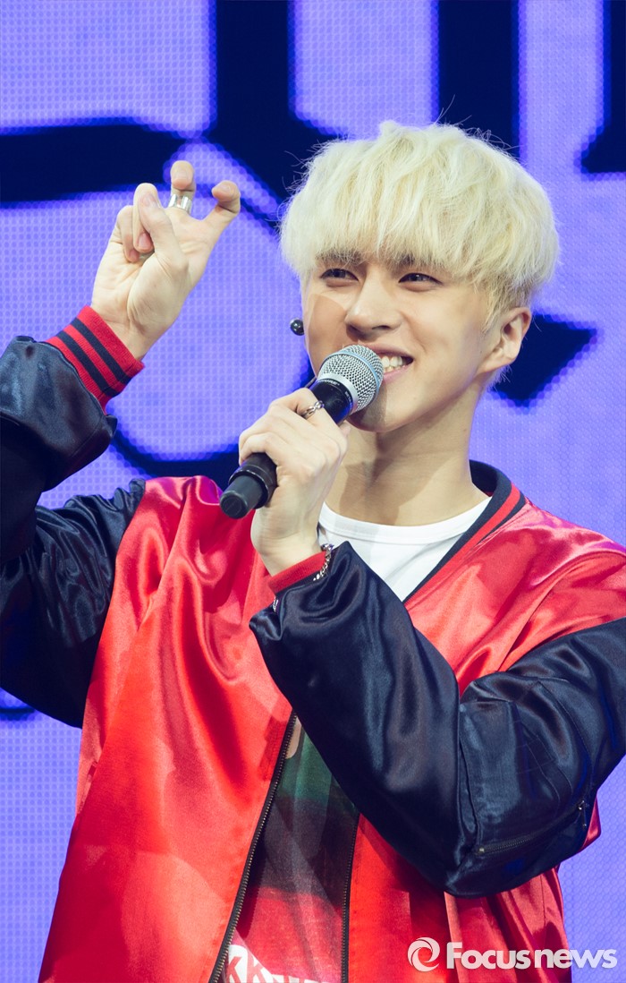 홀서울=포커스뉴스) 19일 오후 서울 마포구 롯데카드 아트센터에서 열린 아이돌그룹 VIXX의 싱글앨범 'Zelos' 발표 쇼케이스에 참여한 멤버 켄이 인사말을 하고 있다.