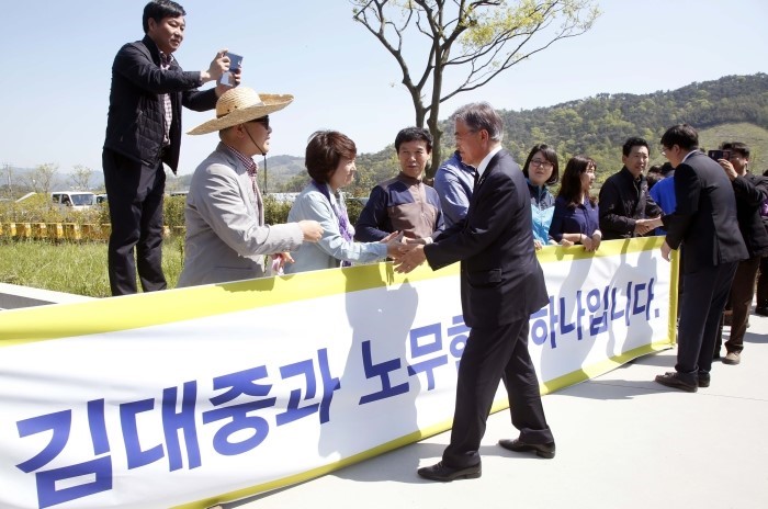 (서울=포커스뉴스) 문재인(왼쪽) 더불어민주당 전 대표와 故 김대중 전 대통령의 삼남 김홍걸 국민통합위원장이 19일 경남 김해 봉하마을을 방문해 故 노무현 전 대통령 묘역 참배를 마친 뒤 지지자들과 인사하고 있다. <사진제공=문재인 의원 블로그>
