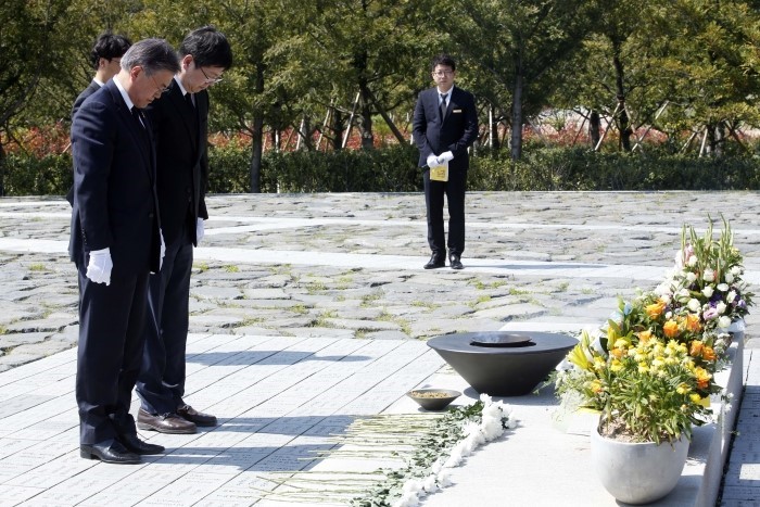 (서울=포커스뉴스) 문재인(왼쪽) 더불어민주당 전 대표와 故 김대중 전 대통령의 삼남 김홍걸 국민통합위원장이 19일 경남 김해 봉하마을을 방문해 故 노무현 전 대통령 묘역 참배를 하고 있다. <사진제공=문재인 의원 블로그>