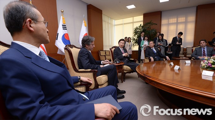 (서울=포커스뉴스) 윤병세 외교부 장관이 19일 오후 서울 종로구 외교부에서 열린 한미일 외교차관 접견에서 토니 믈링컨 미국 국무부 부장관과 대화를 나누고 있다.