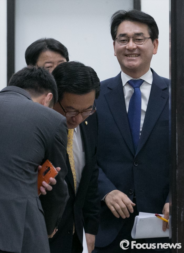 (서울=포커스뉴스) 김종인 더불어민주당 비대위 대표의 비서실장으로 임명된 박용진(오른쪽, 서울 강북을) 당선인이 20일 오전 서울 여의도 국회에서 비상대책위원회의에 앞서 당직자들과 대화하고 있다.