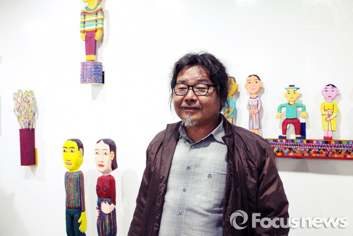 (광주=포커스뉴스) 빨강·노랑·파랑. 강렬한 원색으로 치장한 목각 인형들이 전시장 입구에서 반긴다. 제각기 다른 시선과 포즈로 보는 재미를 더한다. 형형색색의 울퉁불퉁한 목각 인형에서 투박하지만 정겨운, 그리고 따뜻한 사람 냄새가 묻어난다. 작품을 만든 윤남웅(53) 작가처럼 말이다.