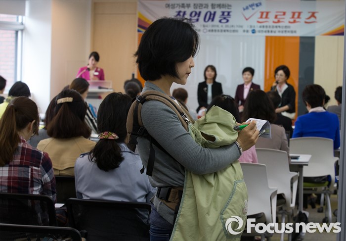 (세종=포커스뉴스) 20일 오전 세종시 조치원읍 세종창조경제혁신센터에서 열린 창업여풍 세 번째 프로포즈 여성가족부장관과 함께하는 토크콘서트에서 참석자가 아이를 안고 토크콘서트를 바라보고 있다.