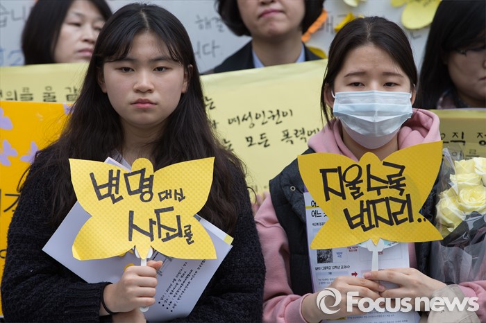 (서울=포커스뉴스) 20일 오후 서울 종로구 옛 주한일본대사관 앞에서 피해 할머니들을 비롯한 한국정신대문제대책협의회와 참석자들이 '제1227차 일본군 위안부 문제해결을 위한 정기 수요시위'를 하고 있다.