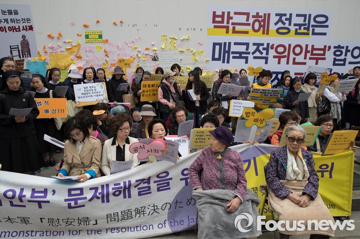(서울=포커스뉴스) 20일 오후 서울 종로구 옛 주한일본대사관 앞에서 피해 할머니들을 비롯한 한국정신대문제대책협의회와 참석자들이 '제1227차 일본군 위안부 문제해결을 위한 정기 수요시위'를 하고 있다.