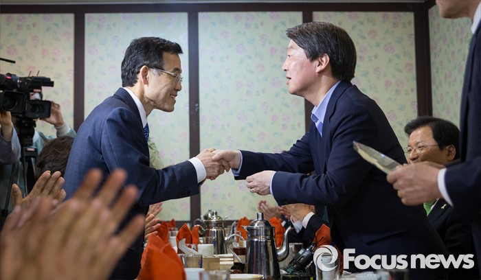 (서울=포커스뉴스) 안철수 국민의당 상임공동대표가 20일 오후 서울 마포 불교방송국 지하 1층의 한 음식점에서 열린 국민의당 소속 제19대 국회의원 오찬 간담회장에 참석해 임내현 의원에게 감사패를 전달하며 인사하고 있다.