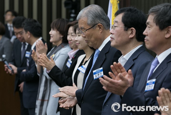 (서울=포커스뉴스) 20일 오전 서울 여의도 국회에서 열린 더불어민주당 20대 총선 당선자 대회에 참석한 김종인(오른쪽 세번째) 비대위 대표가 비례대표 당선인 인사에 앞서 생각에 잠겨 있다.