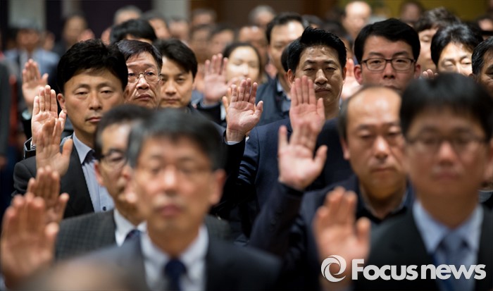 (서울=포커스뉴스) 20일 오후 서울 송파구 교통회관에서 택시노사 4개 단체 및 택시업계 종사자들이 교통안전 향상 결의문 선서를 하고 있다.