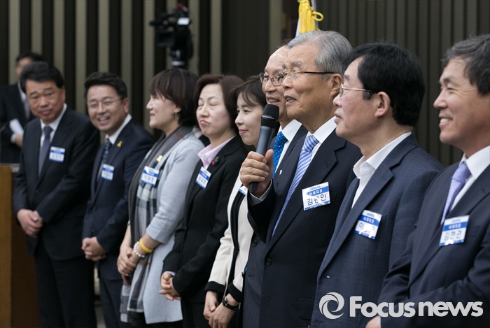 (서울=포커스뉴스) 20일 오전 서울 여의도 국회에서 열린 더불어민주당 20대 총선 당선자 대회에 참석한 김종인 비대위 대표가 비례대표 당선인들과 함께 인사하고 있다.
