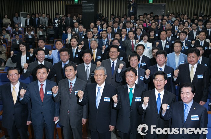 (서울=포커스뉴스) 20일 오전 서울 여의도 국회에서 열린 더불어민주당 20대 총선 당선자 대회에 참석한 김종인 비대위 대표, 이종걸 원내대표와 당선인들이 구호를 외치고 있다.