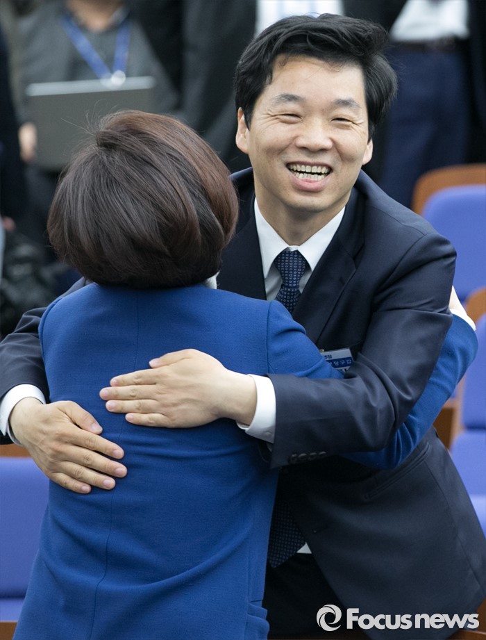 | △ 동료 당선인과 포옹 인사하는 김병관 |