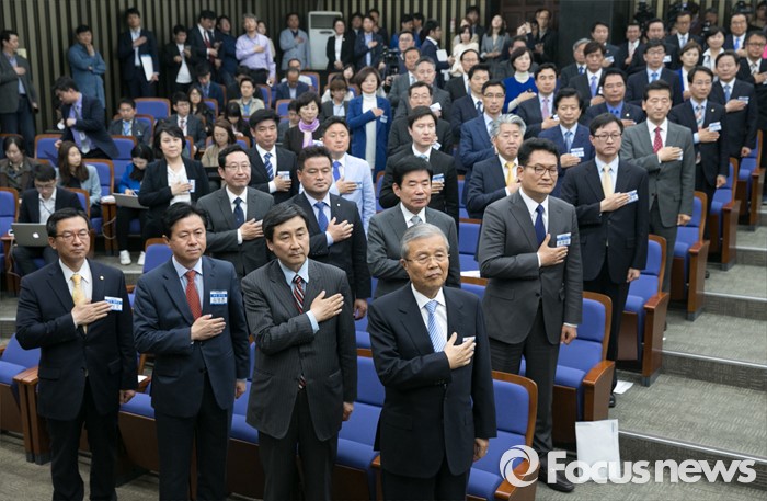 (서울=포커스뉴스) 20일 오전 서울 여의도 국회에서 열린 더불어민주당 20대 총선 당선자 대회에 참석한 김종인 비대위 대표, 이종걸 원내대표와 당선인들이 국기에 대한 경례를 하고 있다.