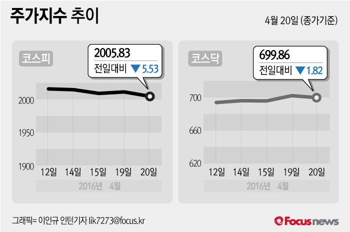 (서울=포커스뉴스) 20일 코스피지수는 전날 보다 0.27%(5.53포인트) 내린 2005.83에 장을 마쳤다. 코스닥지수는 전일 대비 0.26%(1.82포인트) 내린 699.86에 마감했다.
