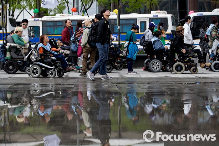 (서울=포커스뉴스) 20일 오후 서울 광화문 광장에서 420장애인차별철폐연대 공동투쟁단 단원들이 '420장애인차별철폐 투쟁결의대회'를 하고 있다.