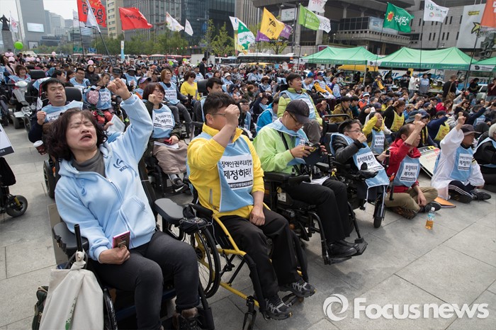(서울=포커스뉴스) 20일 오후 서울 광화문 광장에서 420장애인차별철폐연대 공동투쟁단 단원들이 '420장애인차별철폐 투쟁결의대회'를 하고 있다.