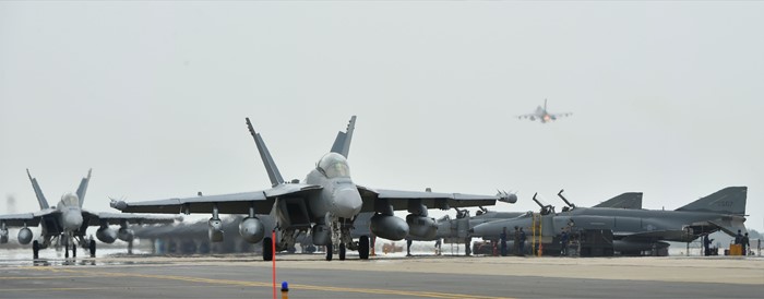 (서울=포커스뉴스) 지난 15일부터 오는 29일까지 전북 군산 비행장에서 실시되고 있는 한·미 공군 대규모 항공전역훈련인 맥스썬더 훈련에 참가한 미 해병대 F/A-18 호넷 전투기가 이륙 전 활주하고 있다. <사진제공=공군>