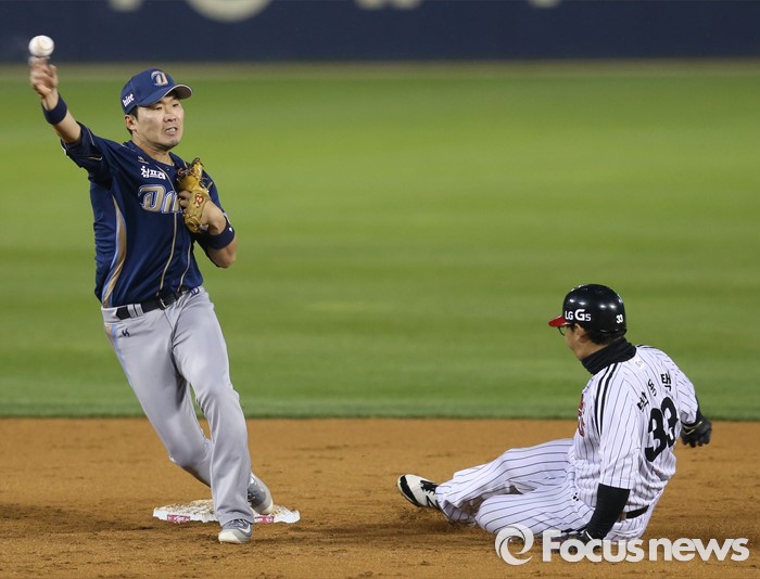 (서울=포커스뉴스) 20일 서울 잠실구장에서 열린 2016 프로야구 NC-LG 경기 3회말 좌전안타로 진루한 LG 박용택이 이병규의 유격수앞 땅볼때 2루에서 포스아웃되고 있다.