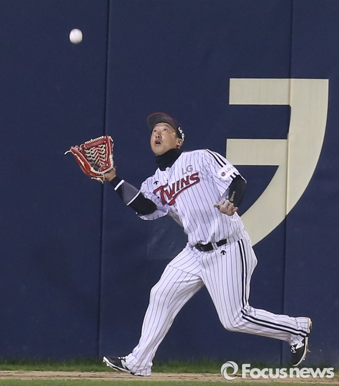 (서울=포커스뉴스) 20일 서울 잠실구장에서 열린 2016 프로야구 NC-LG 경기 8회초 LG 좌익수 이병규가 NC 헤인즈의 타구를 펜스 앞에서 잡고 있다.