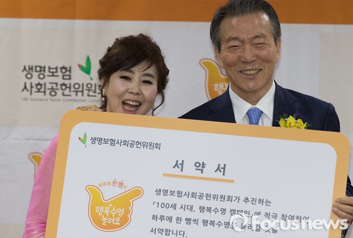 (서울=포커스뉴스) 21일 오전 서울 종로구 센터포인트빌딩에서 열린 '생명보험사회공헌위원회 '100세 시대 행복수명 캠페인' 홍보대사 위촉식에 참석한 가수 이애란(왼쪽)과 이수창 공동위원장이 기념사진을 찍고 있다.