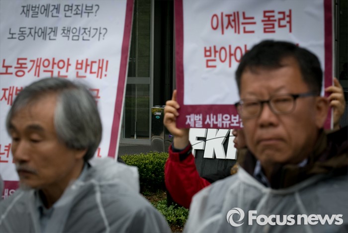 (서울=포커스뉴스) 21일 오전 서울 여의도 전경련회관 앞에서 재벌사내유보금환수운동본부 등 관련단체 회원들이 재벌사내유보금 현황발표 및 환수운동 선포 기자회견을 하고 있다