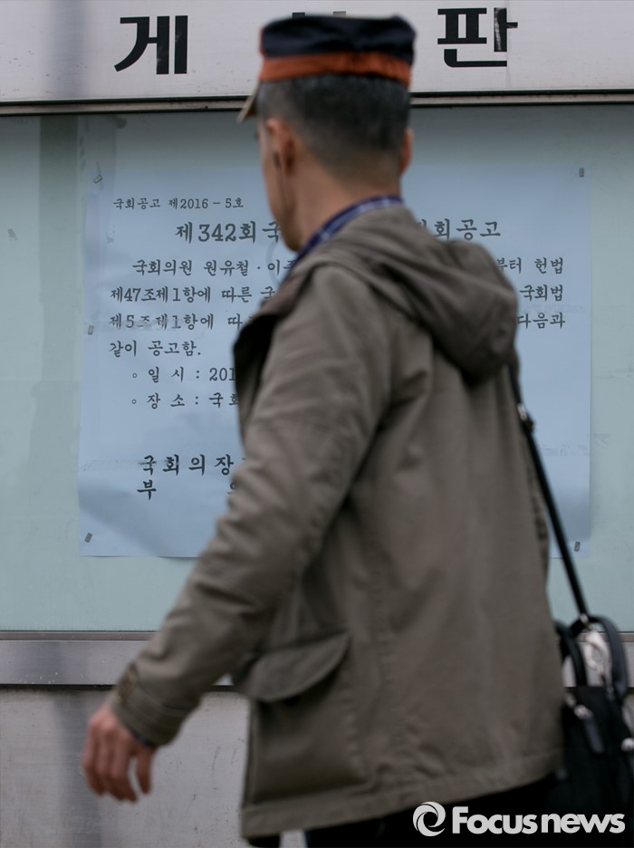 (서울=포커스뉴스) 21일 오후 서울 여의도 국회 앞 게시판에 19대 마지막 임시국회를 알리는 공고가 게시되어 있다.